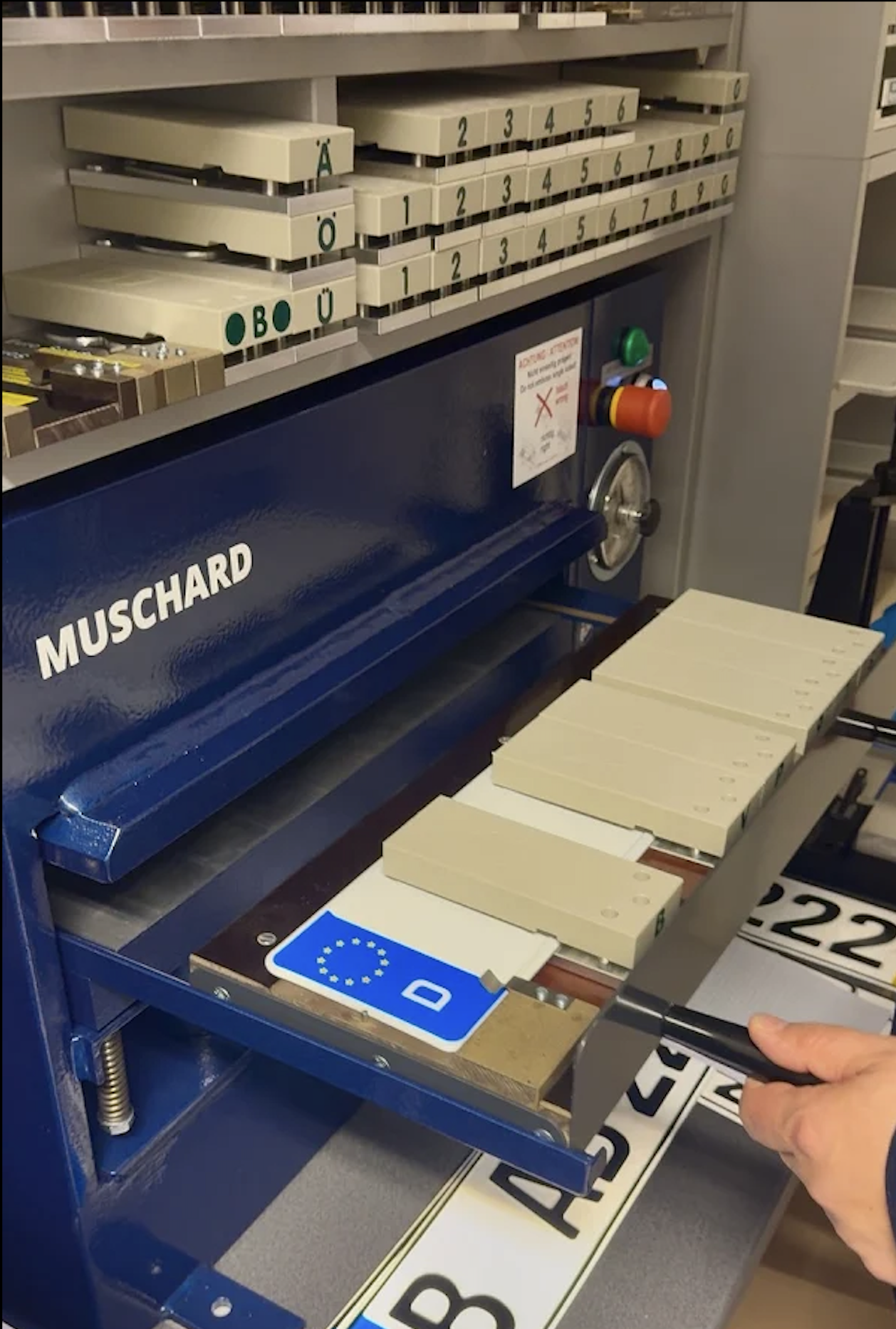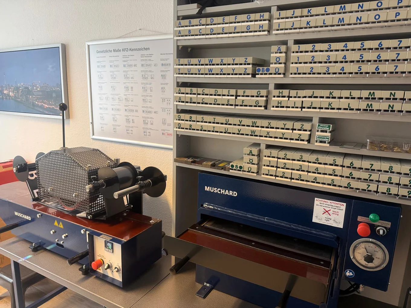 Wir verwenden professionelle Prägepressen und DIN‑zertifizierte Rohlinge. Dadurch erhalten Sie langlebige, reflektierende Kennzeichen in perfekter Qualität.